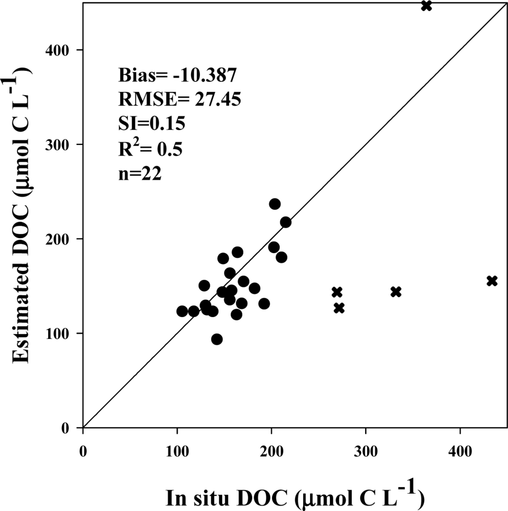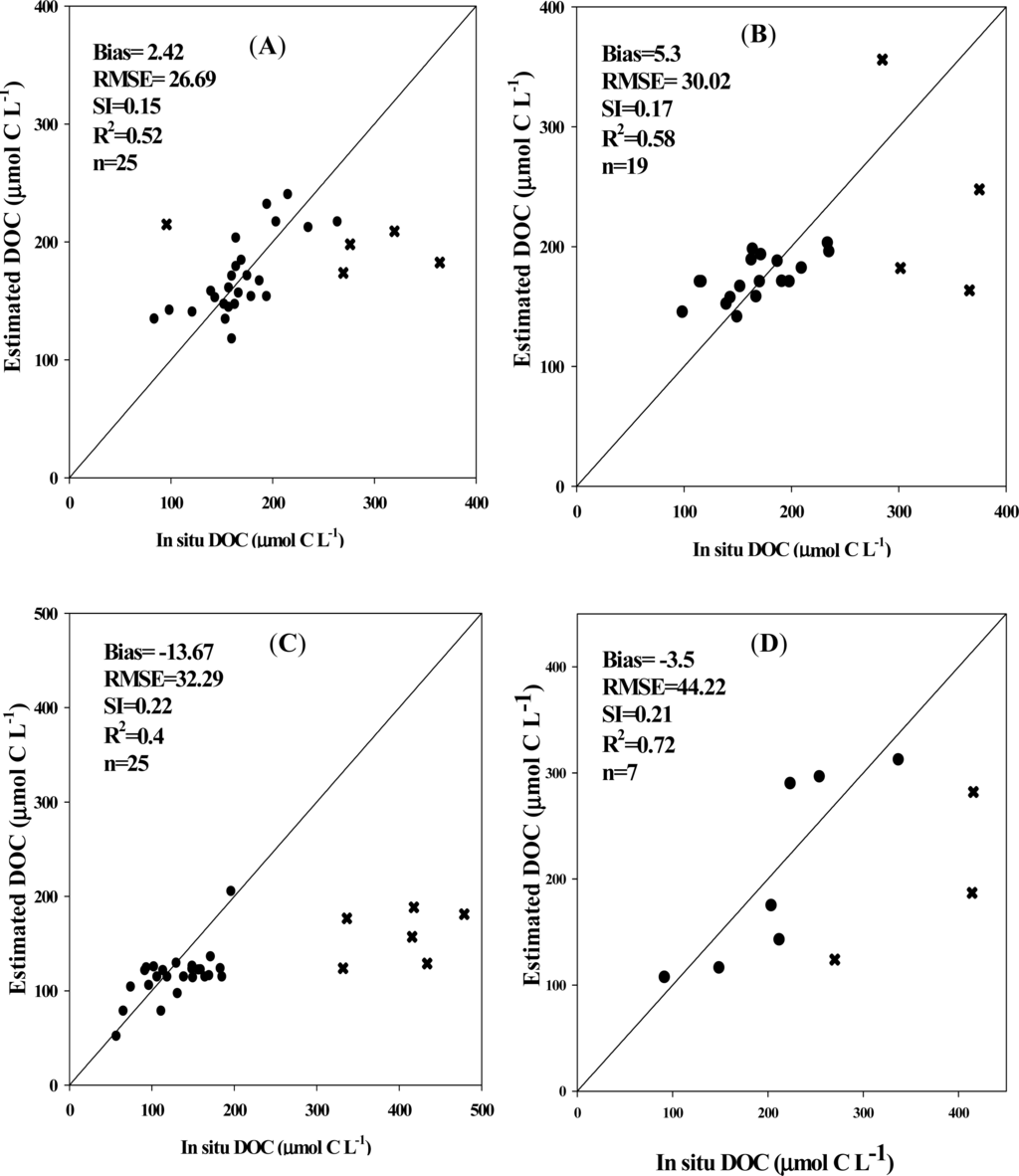 These algorithms were applied to SeaWiFS data to generate surface DOC concentration map (Figure 5). The performance of the newly developed DOC algorithm was examined just for the spring-winter period (Figure 6) due to the paucity of satellite-derived Rrs data in summer. The results of the statistical analysis indicate that retrieval of DOC concentration (μmol·C·L−1) was reasonable (Bias = −10.38, RMSE = 27.45, SI = 0.15, R2 = 0.5, and N = 22). Surface DOC concentration obtained remotely using the DOC algorithm (Equation (5)) indicated a 7% percentage difference between SeaWiFS-estimated DOC and field DOC for spring-winter period. However, algorithm performance was found to degrade at elevated DOC concentrations (>250 μmol·C·L−1) and in shallower nearshore and river plume waters.