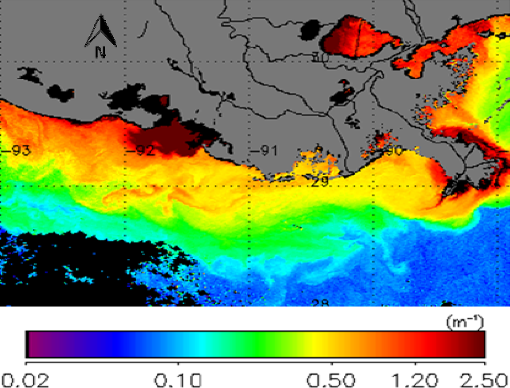 Conservative behavior between CDOM absorption coefficient and DOC has been reported in different types of water bodies [8,25–28]. CDOM absorption coefficient (aCDOM(λ)) and DOC concentration are highly correlated with each other in regions where the mixing of fresh and oceanic waters control the variability of each parameter and terrestrial dominance is strong [29]. These conditions have enabled satellite estimates of DOC using the relationship between CDOM-DOC and CDOM-Rrs band ratios [7,22]. Mannino et al.[22] developed algorithms to derive DOC through the relationship between the aCDOM at 412 nm, 355 nm, DOC, and Rrs ratios for MODIS/Aqua and SeaWiFS in coastal waters of the US Middle Atlantic Bight. Del Castillo and Miller [7] applied the Rrs(510)/Rrs(670) band ratio to SeaWiFS imagery to retrieve DOC in the Mississippi River plume. The high rates of water discharge containing elevated levels of DOC and CDOM by the Mississippi and Atchafalaya Rivers into the coastal waters strongly impacts the biogeochemical processes and fluxes in the northern Gulf of Mexico. Satellite ocean color remote sensing offers the capability to monitor CDOM and DOC distribution spatially and temporally and to improve understanding of the carbon cycling in this large river delta-front estuary (LDE) [30].