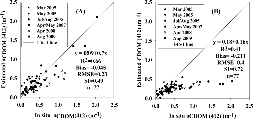 The matchup comparison between in situ aCDOM(412) and MODIS-derived CDOM showed an overestimation of CDOM by MODIS (24%, the percentage difference between satellite estimated CDOM and field CDOM) which could due to interference by chlorophyll-a on the Rrs(488)/Rrs(555) band ratio used for aCDOM(412) retrieval. However, other factors such as the time difference between satellite overpass and field measurement, pixel box size, and errors and uncertainties associated with satellite-derived Rrs used to develop the empirical algorithm can accentuate these discrepancies. Since CDOM concentration is highly variable spatially and temporally in our study area, appropriate available time difference (less than 5 h) and pixel box size (1 × 1) could improve these disparities.