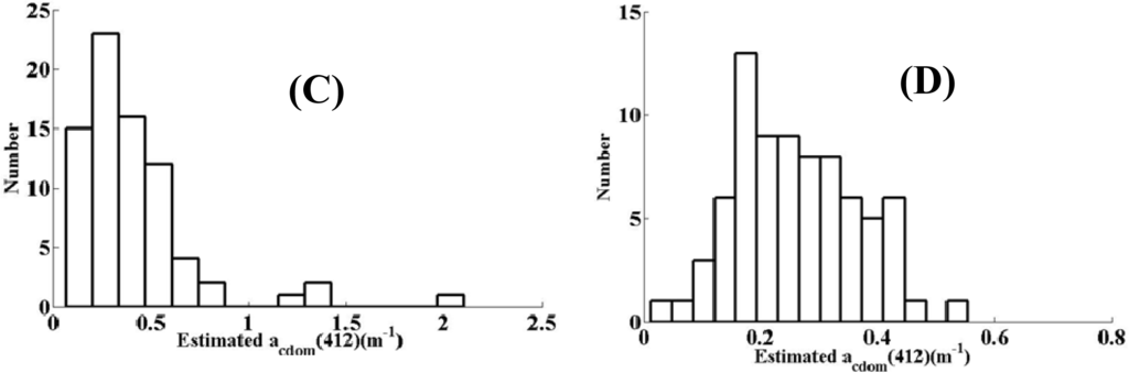 Table 6 presents Rrs ratio and coefficient values (A, B, and C) for MODIS and MERIS. The regional CDOM empirical algorithms were applied to MODIS and MERIS data (Figure 9(A,B)) to obtain surface CDOM absorption maps. The black regions in the CDOM images could be due to failure of the atmospheric correction algorithm in coastal and turbid waters. In addition, the regions along the coast and estuaries exhibit high CDOM/DOC concentrations, where the MODIS/MERIS algorithms fail to estimate CDOM/DOC most likely due to interference by sediments and chlorophyll. These CDOM empirical relationships were evaluated using in situ aCDOM(412) data which were independent from the data utilized for algorithm development (Figure 9(C,D)). The validation matchup comparison between in situ and satellite-derived aCDOM(412) illustrates estimation of aCDOM(412) with Bias = 0.093, RMSE = 0.176, and R2 = 0.4 for MODIS, and Bias = 0.089, RMSE = 0.3, R2 = 0.42 for MERIS (Table 7). We excluded outliers to improve the evaluation analyses (Figure 9(C,D)) (see Discussion). The DOC retrieval algorithms for both MODIS and MERIS were constructed by combining the aCDOM(412)-Rrs relationship (Equation (7)) with seasonal aCDOM(412)-DOC relationships (Equations (2) and (3)). The resulting seasonal DOC-Rrs relationships for the spring-winter and the summer seasons, respectively, are: