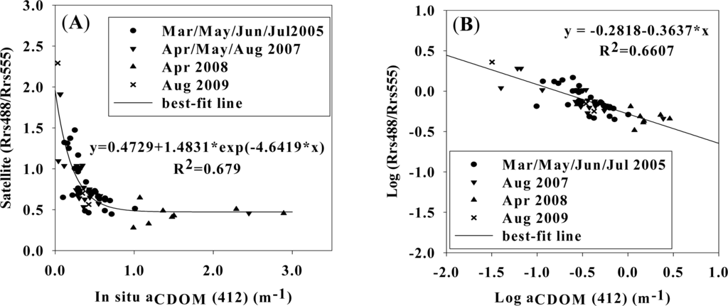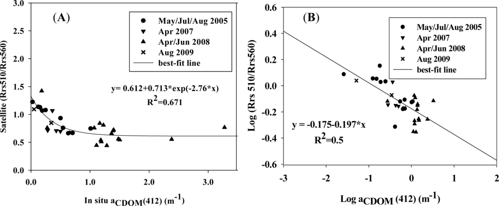 The second condition for estimating DOC concentration using satellite ocean color sensors is to provide a robust relationship between Rrs band ratio and CDOM absorption coefficient to retrieve CDOM remotely. Then DOC concentration can be derived through this relationship and the CDOM-DOC relationship. The D’Sa et al.[18] SeaWiFS empirical algorithm developed using the relationship between in situ aCDOM(412) measurements and reflectance ratios during three field cruises in spring and fall of 2000 and March 2002 in the northern Gulf of Mexico was: