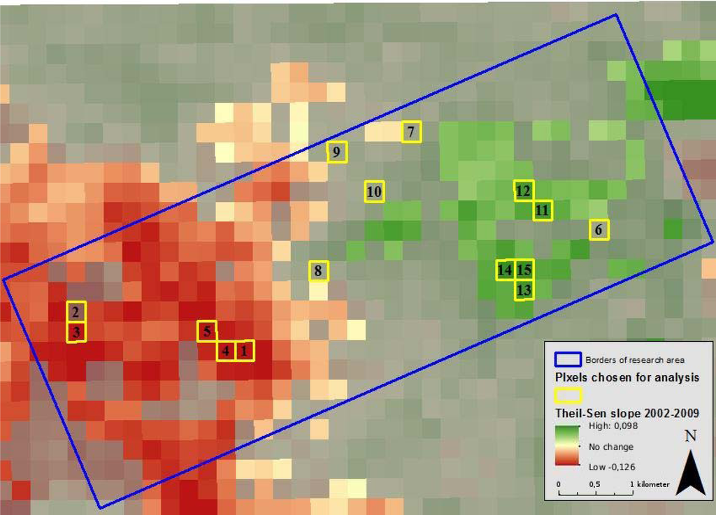 For this detailed analysis, we picked 15 pixels according to their Theil-Sen trend, five pixels with the highest negative Theil-Sen trend, five pixels with the highest positive trend and five pixels with the lowest MODIS iNDVI change (Table 2). The location of these pixels can be seen in Figure 2.