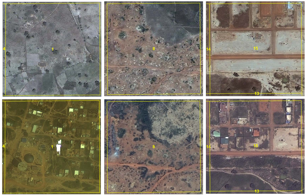 During the months of February–March 2011, a detailed field study was conducted in the study area. The field work included spatial survey and characterization of five random squares of 300 × 300 m, which are located within the study area. The purpose of the field work was to collect qualitative data to gain a detailed understanding of the occurrence of features (manmade constructions and perennial vegetation) in the peri-urban and urban landscapes of Ouagadougou. The field work allowed us to better identify individual features from the Quick Bird images for visual interpretation of land cover classes (Table 1; mud-brick houses in no-parceled areas, sheds in parceled areas, permanent houses, small trees and bushes, large trees).