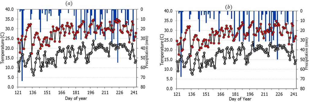 Figures 1 and 2 show the daily maximum (red) and minimum (gray) temperature and precipitation (blue) data at model calibration and model validation sites, respectively. These sites are distributed across the High Plains of the US and cover a wide range of agriculture vegetation types (Table 1). We also used a published dataset of crop coefficients from SCAL [28], obtained from NEBFLUX (Nebraska Water and Energy FLux Measurement, Modeling and Research Network) [13]. Both networks have micro-metrological towers that are used to monitor fluxes over agriculture sites.
