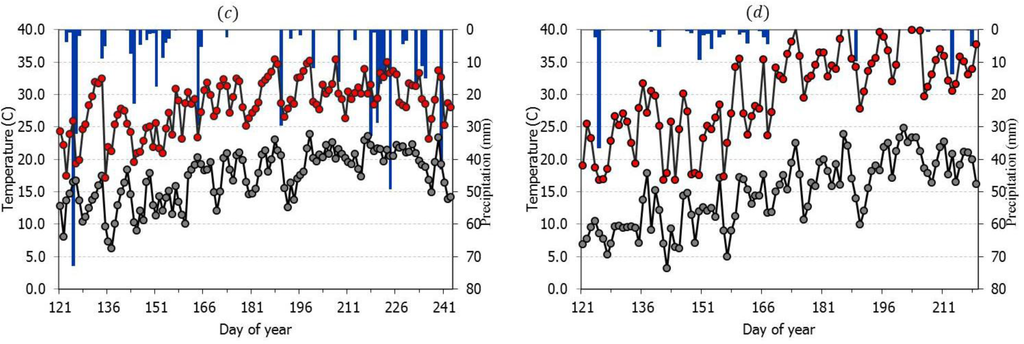 Seasonal progression of weather (maximum (red) and minimum (gray) temperature, precipitation (blue)) data at model calibration sites: (a) Mead Irrigated Rotation, NE, USA (Year 2007); (b) Mead Irrigated, NE, USA (Year 2007); (c) Mead Rainfed, NE, USA (Year 2007); (d)Cottonwood, SD, USA (Year 2007).