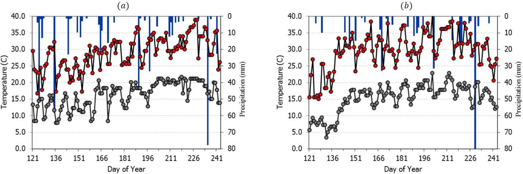Seasonal progression of weather (maximum (red) and minimum (gray) temperature, precipitation (blue)) data at model validation sites (a) South Central Agricultural Laboratory (Year 2007), (b) South Central Agricultural Laboratory (Year 2006).
