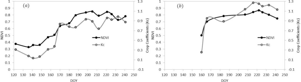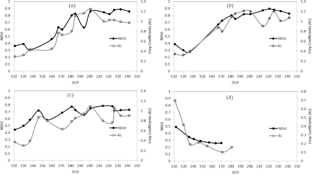 An increase in vegetation activity is also observed before the cropping season, because of the growth of vegetation at the onset of the spring rainy season. The respective fluctuation of crop coefficients for agriculture and grass is seen throughout the season, which shows the strong correlation between the NDVI and crop coefficients. The maximum NDVI of irrigated rotation, irrigated and rainfed maize peaks at 0.84 by the end of July (DOY 215) and 0.77 (DOY 221), respectively. It is obvious that the NDVI of irrigated maize is greater than that of rainfed maize throughout the growing season (Figure 4). Maize is usually planted in late April to early May and harvested in late September to early November.