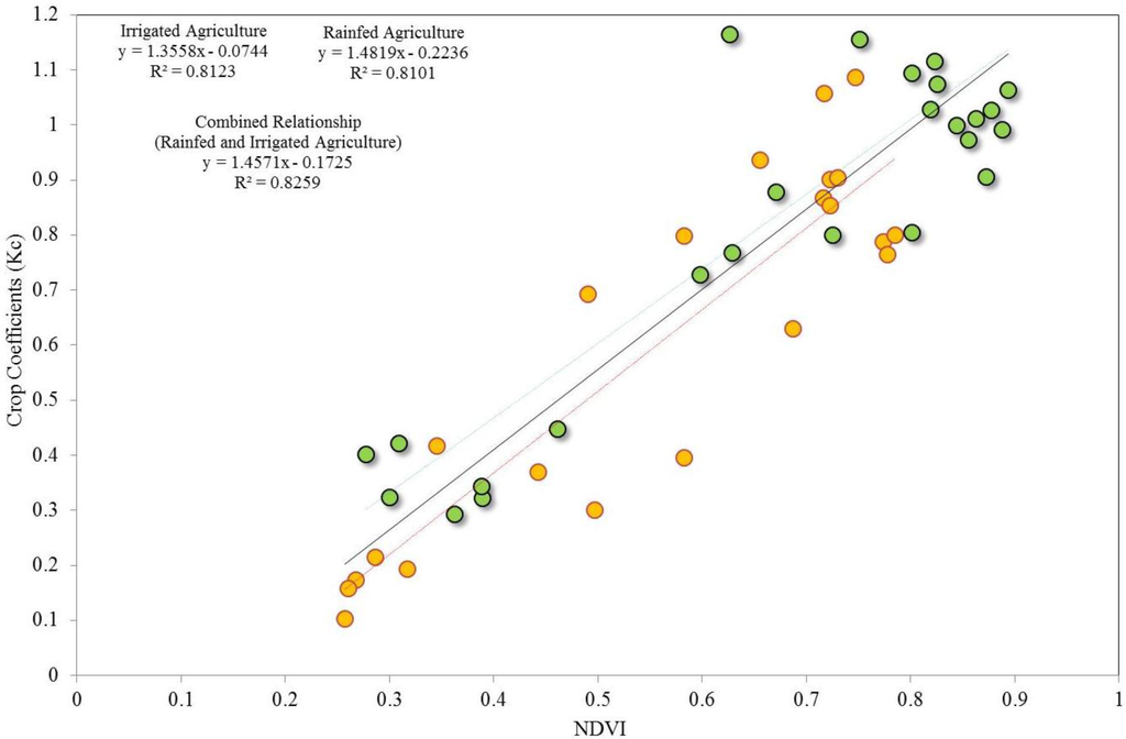 Figure 5 shows the relationship between NDVI and the crop coefficient for irrigated agriculture, rainfed agriculture and the combined relationship for irrigated and rainfed crops. There was a strong correlation between NDVI and the crop coefficient for all of the crops represented in the figure. The combined relationship between NDVI and the crop coefficient for rainfed and irrigated agriculture from all modeling locations is: