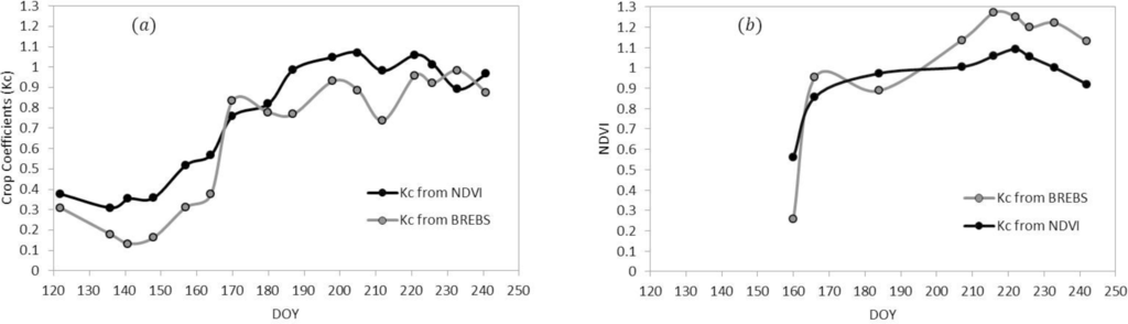 The crop coefficient (Kc)-based estimation of crop evapotranspiration (ETc) is one of the most commonly used methods for irrigation water management at the field scale. Crop evapotranspiration (ETc) can be calculated using the Kc defined as the ratio of crop evapotranspiration to some reference evapotranspiration (ETo) defined by weather data [1,2]. In this framework, Kc values are specific to each crop (and to the method used for ETo) and have traditionally been derived from data sets, where measured ETc for a well-watered crop is divided by a standard reference ETo (usually grass, but sometimes alfalfa and, most recently, not crop-specific, but only a tall or short crop [3])). The crop coefficients representative of well watered conditions are tabulated for the practical purpose of crop water management among engineers, farmers and irrigation managers [3–5]. During the crop growing season, the value of Kc for most agricultural crops increases from a minimum value at emergence, in relation to changes in canopy development, until a maximum Kc is reached at about full canopy cover. A crop coefficient curve is the seasonal distribution of Kc, often expressed as a smooth continuous function in time or some other time-related index. The Kc tends to decline at a point after a full cover is reached in the crop season. The declination extent primarily depends on the particular crop growth characteristics [6,7] and the irrigation management during the late season [1]. Crop coefficients primarily depend on the dynamics of canopies, light absorption by the canopy, canopy roughness, which affects turbulence, crop physiology, leaf age and surface wetness [4]. As a crop canopy develops, the ratio of transpiration to evapotranspiration increases, until most of the evapotranspiration comes from transpiration, and soil evaporation is a minor component. This occurs because the interception of radiant energy by the foliage increases until most light is intercepted before it reaches the soil. Moreover, the relationships between spectral indices and crop coefficients are usually observed for the single crop coefficient. The normalized difference vegetation index (NDVI) has been used extensively for vegetation monitoring, crop yield assessment and drought detection [4,6–8]. Higher NDVI indicates a greater level of photosynthetic activity [8,9]. Increase in crop coefficient caused by higher temperature results in a decrease in soil water and a decline of NDVI, while dense vegetation induces more evapotranspiration and lowers the land surface temperature [10]; or the transpiring canopy is cooler [11]. On the regional scale, the current procedure to estimate Kc and resulting consumptive water use has limitations. The Kc varies in space and in time, due to inherent variability in emergence date, land use pattern, antecedent precipitation, emissivity, vegetation amount and atmospheric boundary conditions, such as air temperature, wind speed and vapor pressure deficit.