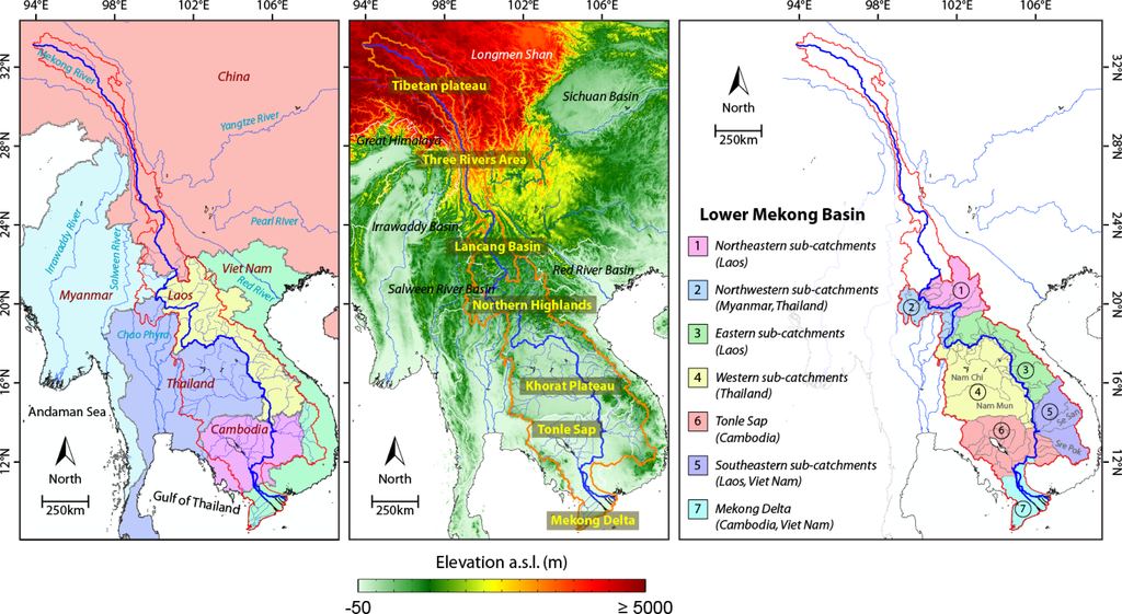 Maps of the Mekong Basin: (a) river network; (b) topography; and (c) main catchments in the Lower Mekong Basin.