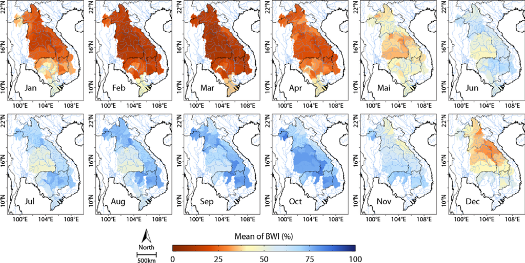Monthly averages of the BWI for different sub-catchment areas calculated using the multi-year SSM time series indicate strong annual variability of soil moisture in the LMB. The wettest period across the LMB is from June to October and the driest months of the year are January to April (Figure 10). This corresponds to the fact that the total annual flow in the LMB occurs in an average year about 75% within just four months between July and October [48]. In December and January, the central and northern parts of the LMB are normally drier than the southern parts. March is the driest month across the LMB. During the wet season from May to September the BWI measurements show relatively drier conditions in Khorat plateau in Thailand compared to the other regions. In October the situation is reversed and the Nam Mun and Nam Chi sub-catchments in Thailand show wetter soil condition than the eastern and northeastern parts of the LMB in Laos. Decreasing of soil moisture in the LMB starts from the Northern Highlands in Laos during first weeks of November followed by other regions with delays of 1–2 weeks. The spatial distribution of the BWI reveals distinctive patterns throughout the LMB showing high variability of soil moisture between sub-catchments.