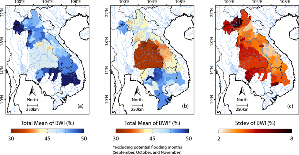 Figure 11(a,b) indicates total averages of BWI with and without considering flooding period and Figure 11(c) shows the standard deviation of the BWI calculated for each sub-catchment. Tropical monsoonal regions are generally associated with a water surplus and a highly reliable flow regime. Nevertheless, the BWI measurements indicated that the soil moisture condition still varies significantly in different parts of the LMB. The regions located in the north and the west of the LMB, show highest variability of soil moisture. The total mean of soil moisture is highest in the Northwestern mountainous regions of Laos, specifically in Nam Mae Kok, Nam Mae Kham, and Nam Mae Ing sub-catchments, as a result of higher rainfall and lower evaporation. The BWI values show a clear surplus of soil moisture in the south and the southeast regions of the LMB, Mekong Delta in Vietnam and the most parts of Cambodia, remarkably in Sre Pok, Se San, and the eastern Tonle Sap sub-catchments. There is also a decreasing gradient of soil moisture observable from east to west across the Mekong River within the regions located in the central LMB. The highest evaporation occurs over the Khorat Plateau in northeast Thailand, one of the driest parts of Southeast Asia [2], which is also reflected in the soil moisture observations. In spite of significant soil moisture excess during the rainy season in summer, the total mean of soil moisture in this region is rather low compared to the other regions across the LMB. This implies that the area is particularly vulnerable to critically low levels of soil moisture during winter and has a high occurrence potential of agricultural drought conditions