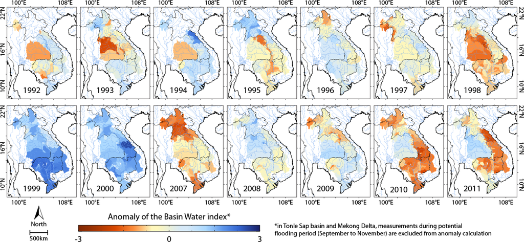 The anomalies of BWI were calculated for all sub-catchments in the LMB using the total mean and standard deviation of soil moisture in catchment scale. Figure 12 illustrates the anomaly maps of BWI. Soil moisture retrieval is not possible during flooding period in Tonle Sap basin and Mekong Delta as the soil surface is usually covered largely with water. Therefore during the flooding period, the scatterometer measurements in these sub-catchments are excluded from the BWI anomaly calculation. Occurrence and location of the extreme events across the LMB differs each year depending on rainfall patterns and climate conditions. According to [2], there is no significant connection in the severity of the annual flood or drought between the northern and southern parts of the LMB, as the weather generating mechanisms which cause extreme conditions such as tropical storms and cyclones are usually not large enough to affect the region as a whole. The extreme wet conditions across the LMB between July and October are associated each year with a massive flood wave towards the LMB lowlands. During the flood season, water flows from the Mekong and Bassac rivers into the Tonle Sap Lake. From October onwards the flow direction is reversed and the water is drained back into the Mekong and Bassac rivers [49]. Each year, vast regions across the Cambodian lowlands and Vietnam delta are flooded for 2–4 months, affecting the life of several million people [50]. Analysis of the BWI time series in the periods of 1991–2000 and 2007–2011 showed that the years 1999 and 2000 were the wettest years. In 2000, severe flooding occurred with extended duration across the Cambodian lowlands and the Vietnam delta. The flooding event in 2000 led to over 800 fatalities, and economic damage exceeding 400 million USD [51]. Droughts in the LMB can occur at any time of the year. Extreme and prolonged dry conditions have considerable impacts on fisheries and agriculture. Unlike floods, droughts have no benefits and cause immense costs for the people living in the LMB. Droughts occur more often in Laos and Thailand (with the likelihood of two years in five) than in Cambodia and Vietnam (every three years) [2]. The BWI anomaly maps in 1992 show very dry conditions in the Thai sub-catchments (Nam Mun and Nam Chi) which are continued until 1993, predominantly in Nam Chi sub-catchment. The findings comply with hydro-meteorological observations at Vientiane and Kratie in Thailand. In the year 1992, the most severe drought since 1960 occurred when the peak and volume of the flood were 40 percent and more below the average figures [52]. The lowest BWI values in the Mekong Delta were observed in 1997–1998, 2007 and 2010. In 1998, the drought was equally profound in the LMB, especially in the Mekong Delta and the Tonle Sap basins. Tonle Sap lake did not expand as usual, with an estimated flooded area of 7,000 km² compared to a typical season maximum of 15,000 km² [2]. The BWI time series indicate that the year 2007 was a dry year in the whole LMB especially in Northern Highlands in Laos and northern Thailand. In 2010, extreme dry conditions were observable in the most parts of Laos, Cambodia, and the Mekong Delta. This is also confirmed with hydrological observations at Kratie. The total volume of flow at Kratie during the 2010 flood season was even less than that of 1992 which is generally regarded as the most severe drought on record [53]. The BWI anomalies show that the abnormal dry conditions in 2010 persisted until 2011 in the eastern Laos and the northern parts of the Tonle Sap basin.