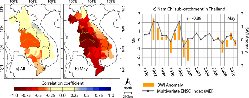 Comparison of the monthly BWI anomalies with Multivariate Enso Index (MEI): correlation coefficients are obtained by: (a) considering all measurements; and (b) considering only the measurements in May, during the periods of 1991–2000 and 2007–2011; (c) Comparison of the BWI and MEI measurements in May in Nam Chi sub-catchment, Thailand.