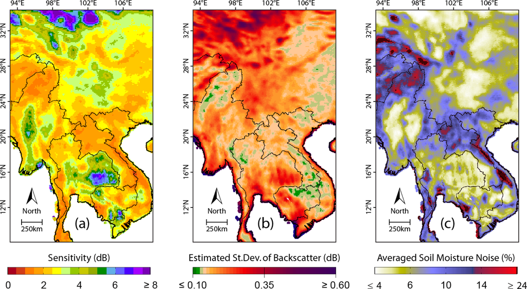 The C-band active sensors have been demonstrated to be suitable instruments for change detection of soil moisture independent to solar illumination and cloud cover [37]. However, the intensity of the backscatter signal is also affected by surface roughness, vegetation structure, and vegetation water content. All these factors influence σ0 at different time scales. At the end the degree of accuracy and reliability of the soil moisture product will depend on the sensitivity of backscatter to the soil surface, the backscatter measurement noise, and the functionality of the retrieval algorithm. Figure 2(a) shows the backscatter sensitivity of the ERS scatterometer in Southeast Asia. Sensitivity is the range between the highest and lowest backscatter measurements, which varies mainly depending on the fraction of area covered by vegetation and the vegetation architecture (size, shape, and orientation of trunks, branches, and foliage). Backscatter has the lowest sensitivity to changes at the soil surface in very densely vegetated area like rainforest, where the penetration of the C-band signal is limited and therefore the majority of backscatter comes from the vegetation canopy. The lowest sensitivity in Southeast Asia is evident in Central Vietnam and parts of Laos, northern Myanmar, southwest Cambodia and the southern part of Thailand where dense vegetation dominates (e.g., Thorn forest, evergreen forest).