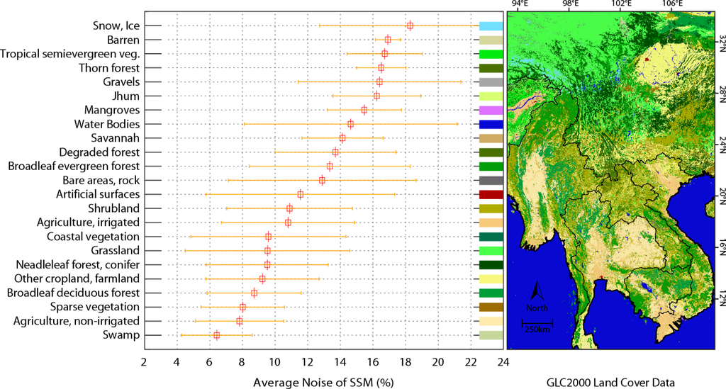 Figure 2(b) shows the Estimated Standard Deviation of backscatter (ESD) and Figure 2(c) shows the mean of the estimated SSM noise in Southeast Asia. The estimated SSM noise can be used to identify areas where the algorithm has the lowest performance. This includes areas with dense vegetation cover, sand deserts, coastal areas, water bodies, areas covered with permanent snow or ice, and areas with complex topography. Figure 3 shows the range and magnitude of the SSM noise averaged for different land cover types based on GLC2000 land cover data [38] in Southeast Asia. However, because of the large footprint size of the scatterometer sensor, the impact of land cover on the SSM noise is not very clear in areas that are characterized by a mixture of different classes of land cover. The highest uncertainty in the soil moisture retrieval occurs when the soil surface is partly covered with water because retrieval is not possible over water bodies. Backscattering from water depends on roughness of the water surface. When the water surface is calm then specular reflection occurs and σ0 is the lowest. The large water reservoirs, shallow bodies of water like swamps, marshes, estuaries, rivers and any set of small bodies of water increases the soil moisture noise depending on the water extent compared to the spatial resolution of the scatterometer. However, the magnitude of backscatter noise can be moderated in presence of vegetation as it is the case in swamp areas in the LMB. In the Mekong river basin, the effect of water on SSM retrieval is becoming critical during the flooding season. The structural properties of the surface and the three dimensional architecture of vegetation have also a clear influence on the backscatter sensitivity and SSM retrieval uncertainty. In general, backscatter from the land surfaces covered by vegetation is governed by the scattering properties of the geometrical elements that can be considered to be made up of vegetation, soil surface and the interaction between the vegetation volume and soil surface in the form of multiple scattering [39–42]. The highest sensitivity and therefore lowest uncertainty in the SSM retrieval is obtained in agricultural regions, shrubs and grasslands. The quality of soil moisture retrieval is degraded over anisotropic surfaces, which could be classified as Barren, Gravels, or even Savannas.