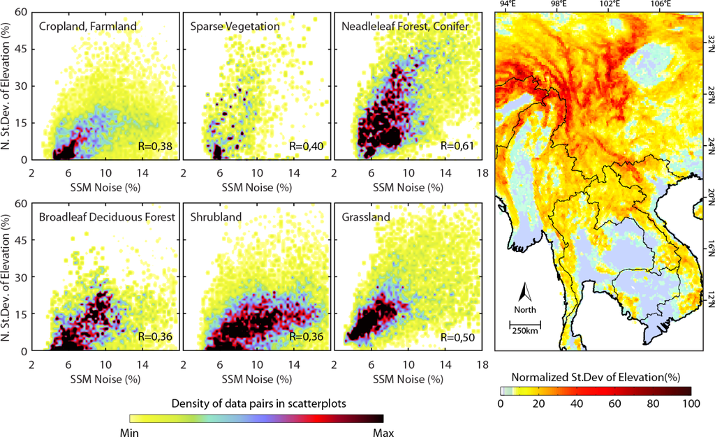 The quality of the SSM retrieval is also affected in areas with complex topography. If the look direction of the sensor becomes perpendicular to the orientation of surface feature, a large portion of incident energy will be reflected back to the sensor. The more oblique look direction in relation to the feature orientation, the less energy will be returned to the sensor. Therefore complex topography can significantly increase the azimuthal noise. The areas with complex topography can be identified by the standard deviation of elevation. Figure 4 (right) indicates the normalized standard deviation of elevation in Southeast Asia based on GTOPO30 digital elevation model data [43]. Scatterplots in Figure 4 show the increasing of the averaged SSM noise with intensifying the degree of topographic complexity.