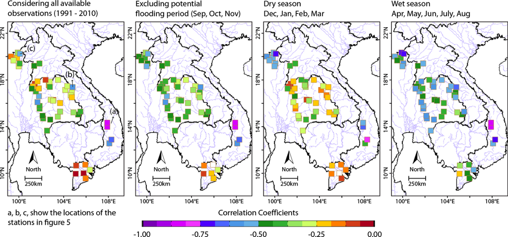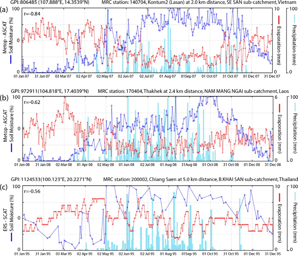 Although the soil moisture is not solely controlled by evaporation, a negative correlation between evaporation and soil moisture is expected in humid regions [45]. Figure 5 shows time series of the SSM compared to the in situ evaporation data at three different stations in the LMB. The results of comparison reveal a significant linear relationship between the SSM and the evaporation across the basin with the most significant correlation of R = −0.85 at Se San sub-catchment in Vietnam. Figure 6 shows the results of analysis for all available evaporation measuring stations. It is shown that the inverse correlation was intensified in wet season after excluding the measurements during the flooding period most evidently in Khorat plateau and Delta region.