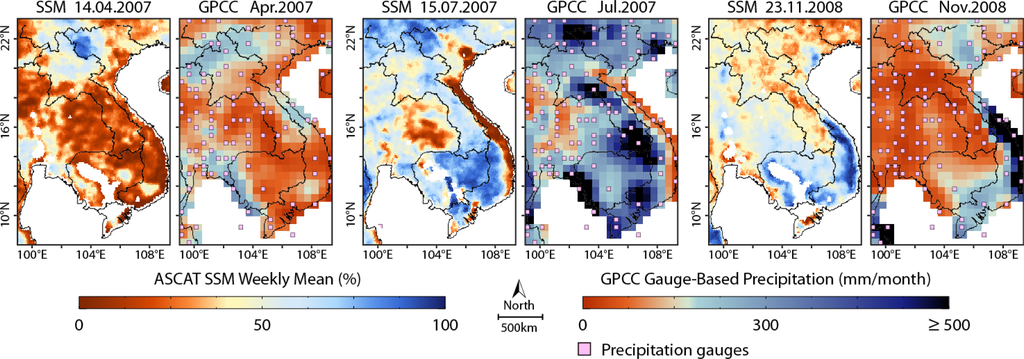 In general, the spatiotemporal variability of soil moisture in the LMB was well captured by the SSM retrieval algorithm. The northern parts of the LMB in Laos and the west side of the Mekong River show the highest variations of soil moisture. The Mekong Delta, Tonle Sap basin and the northern parts of the LMB in Myanmar were identified as the wettest and the Thai sub-catchments in the LMB as the driest regions. The inter-annual variations of the BWI reveal distinct spatial patterns altering from year to year which are confirmed by the reported extreme hydro-meteorological events in the Mekong region. Furthermore, there was a clear indication that the ENSO related phenomena were contained in the BWI anomalies. The reasonable quality of the retrieved soil moisture in the LMB and the high-temporal acquisition capability of the European C-band scatterometers operating in all-weather conditions make the SSM product attractive for monitoring soil moisture dynamics in the LMB which is potentially valuable for numerous applications in hydrological and natural environmental processes such as climate studies, weather forecasting, runoff forecasting, soil erosion prediction, early flood warning, drought monitoring, irrigation planning, and yield monitoring.