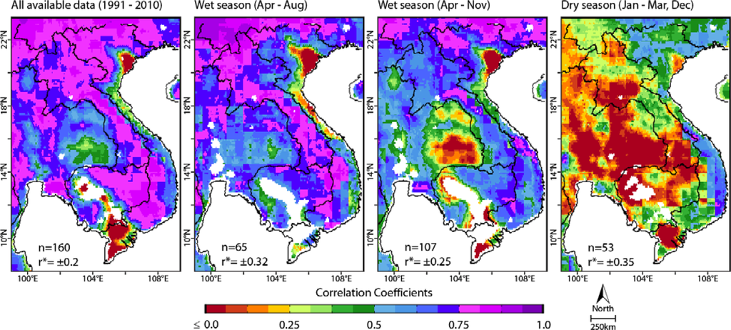 The correlation coefficients are significantly higher in wet season than in dry season. This is because of the specific regional climate of the LMB with distinctive dry season with no or very low precipitation. In agricultural areas especially in Delta region, Khorat plateau and northern Vietnam, correlation coefficients are clearly lower especially during dry season. In such regions the soil moisture regime does not always follow the meteorological conditions and other regional factors like irrigation activities have important influence on soil moisture conditions.