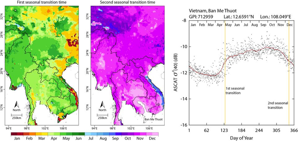 (Left) First and second transitions times determined based on the ASCAT annual backscatter variations. (Right) the annual backscatter at Ban Me Thout, Vietnam shown as an example.