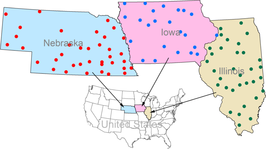 Illustration of study area and selected meteorological stations. The study area covers three states of the United States: Iowa, Illinois and Nebraska. Stations are marked as circle dots, and colors are labeled for different states. The number of meteorological stations of Iowa (blue dots), Illinois (green dots), and Nebraska (red dots) is 23, 33, and 37, respectively.