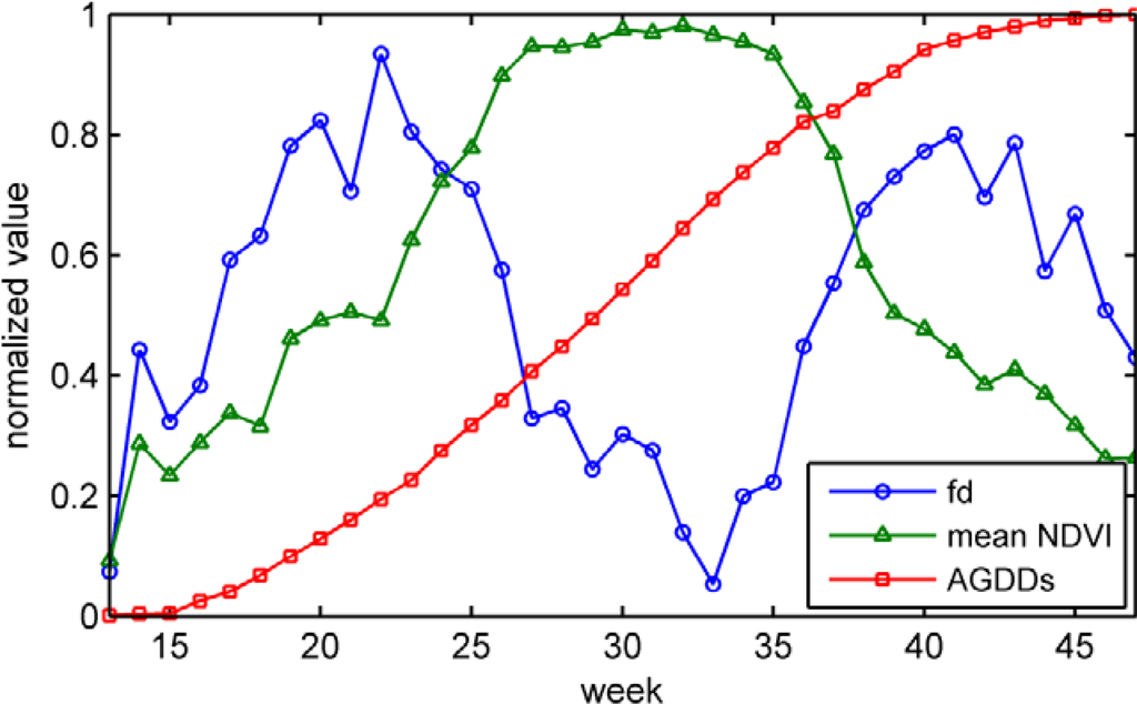 Distributions of normalized mean Normalized Difference Vegetation Index (NDVI), fractal dimension (fd), and AGDDs along the corn life cycle (Iowa, 2007).
