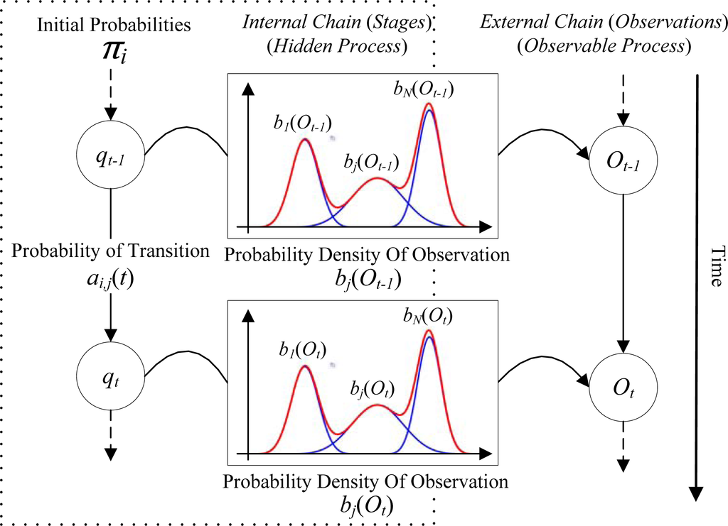 HMM could be understood as combining a Markov chain model with a mixture model [33]. Two embedded stochastic processes in the HMM related to two chains: the external chain of observations and the internal chain of hidden stages (Figure 3). It is capable to represent uncertainties on stage determination and on observation [26]. In addition, “HMMs viewed as mixture” [34] represents that observation at each time node might be impacted by multiple hidden stages, assuming observation that forms N clusters can be modeled as a mixture of N components. A single time node corresponds to a mixture distribution with component densities bi(Ot), i.e., each stage of discrete variable qt represents a different component. The probability of observation is given by