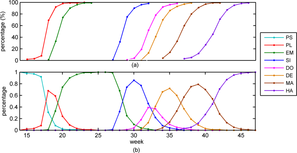 For example, in the 31th week (Iowa, 2011) shown in Figure 4(a), stages of dent (S6), dough (S5) and silking (S4) have completed 1%, 19% and 96%, respectively. Based on Equation (6), we know that this region has 1%, 18%, 77% and 4% of corn plants at dent, dough silking and emerged (S3) stages, respectively (Figure 4(b)).
