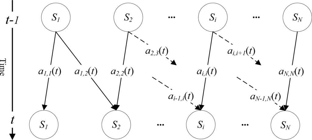 . i and j determine the position of stages with respect to the time variable t. There are four restrictions in Equation (7). The first three relate to self-transition probability at the end, self-transition probability in the chain, and forward stage change, respectively. For example, if qt−1 = S6, then all transitions except a6,6(t) and a6,7(t) are zero element. a6,6(t) and a6,7(t) respectively correspond to the second and third restrictions, which sum up to 1.