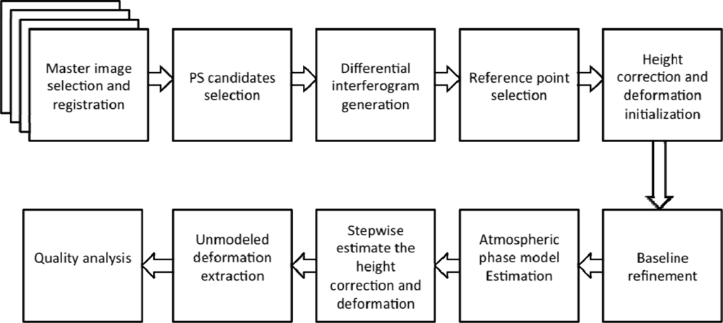 Here, MT-InSAR is performed by IPTA, which is a PSI and/or SBAS technique that has been demonstrated to be able to analyze the differential interferometric phase both spatially and temporally, i.e., the spatial differences between pairs of point targets and the pair differences between different interferograms, only with respect to the HCP [16]. The main procedures of IPTA are shown in Figure 1.