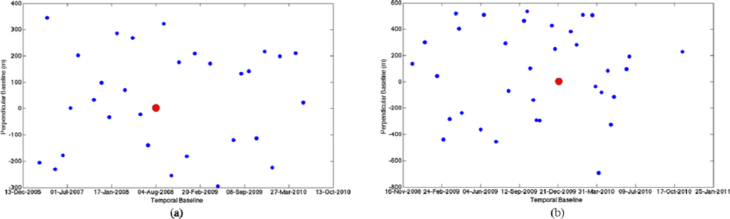 In this paper, 31 scenes of C-band ascending Envisat ASAR images from February 2007 to May 2010 and 35 scenes of X-band ascending CSK SAR images from December 2008 to November 2010 were used. The baseline distribution of interferograms is displayed in Figure 2. For taking ASAR interferograms, we selected the image of August 2008 as the master (the red circle) and the others as slaves (the blue circles), which is displayed in Figure 2(a). The maximum perpendicular baseline was approximately 500 m and the maximum temporal baseline was approximately 400 days. Meanwhile, for CSK acquisitions, the master image was that of December 2009 (the red circle), which is displayed in Figure 2(b). The counter-baselines were 700 m and 400 days, respectively. In this paper, we select the master image based on the condition of maximizing the joint correlation of the interferometric stacks, which may ensure that the quality of interferometric pairs is as high as possible [18].