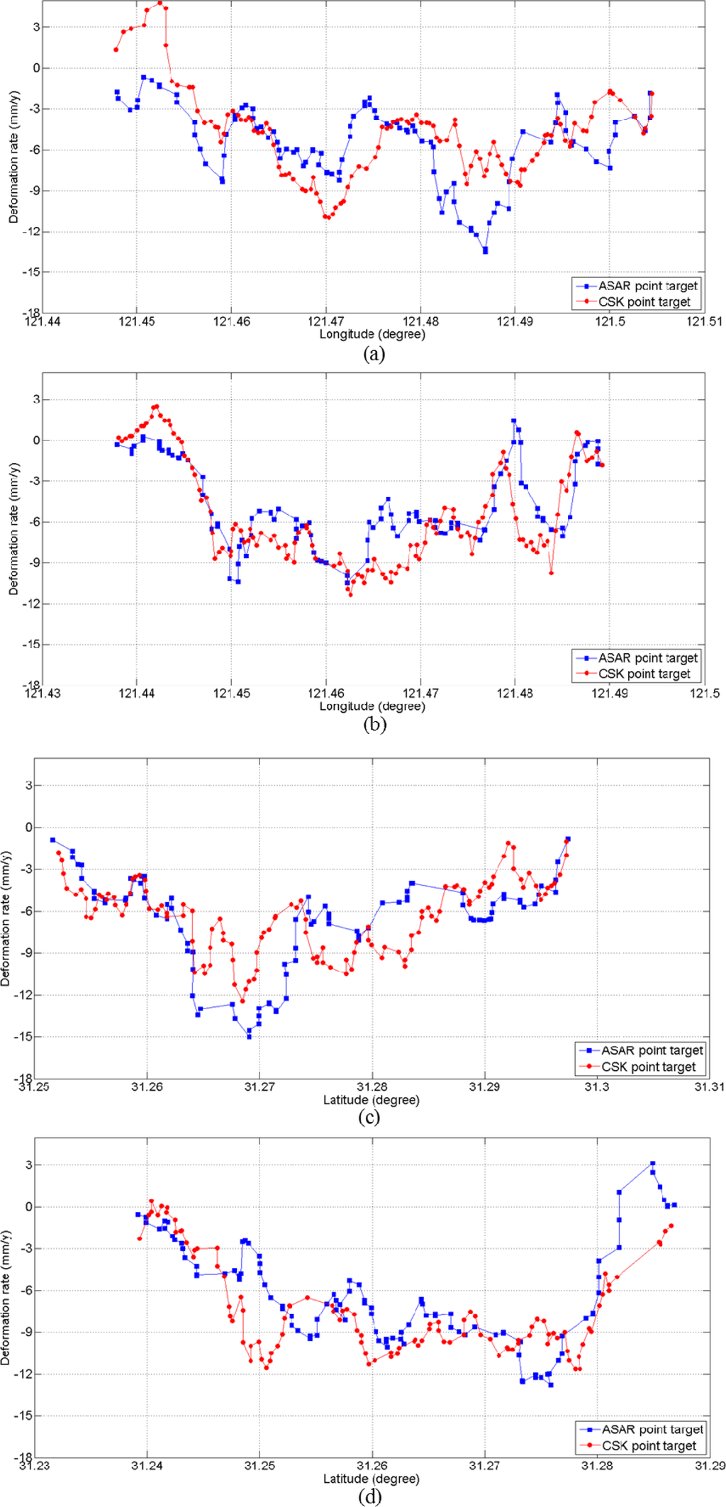 The root mean square error (RMSE) of the differences of the subsidence rates between the two sensors along the four chosen profiles is listed in Table 1. Overall the RMSE is approximately 3 mm/yr, which suggests that the vertical deformation rates by ASAR agree well with that by CSK SAR.