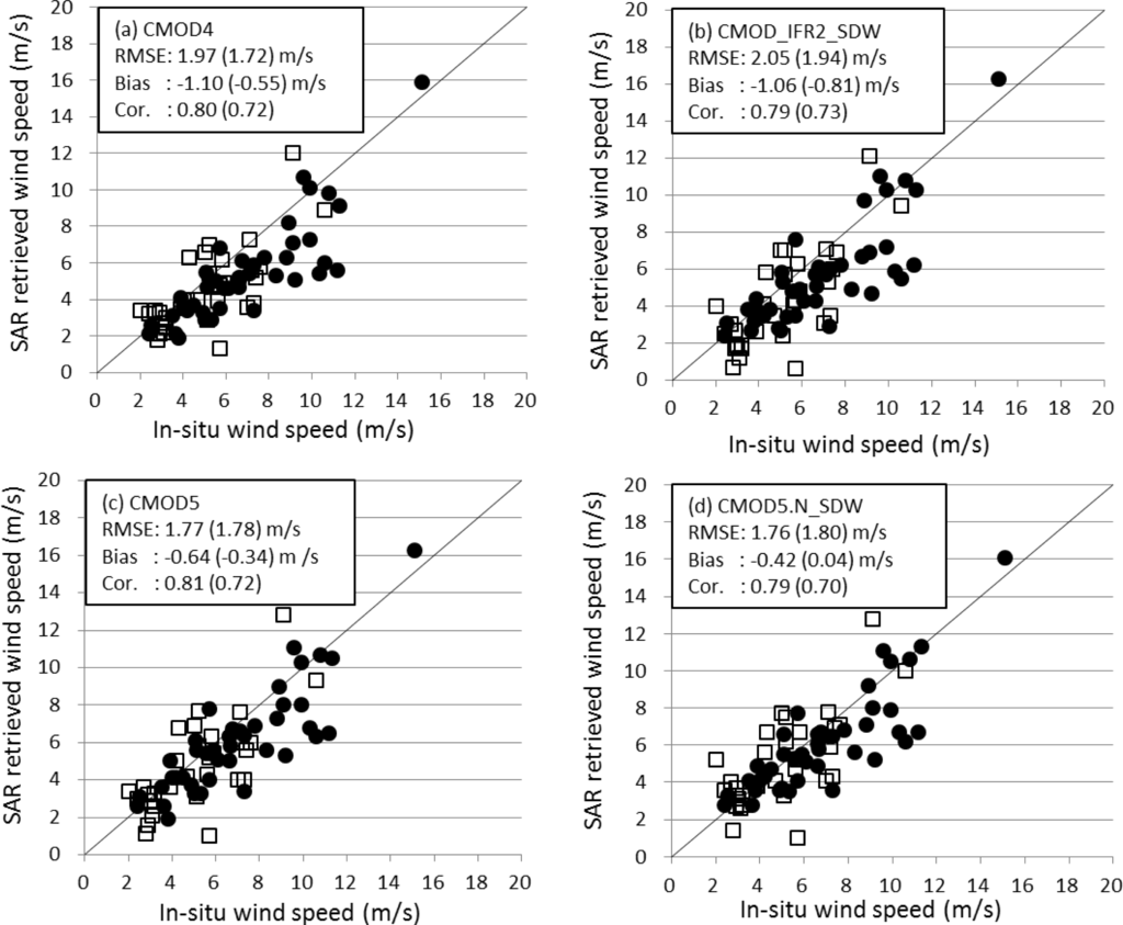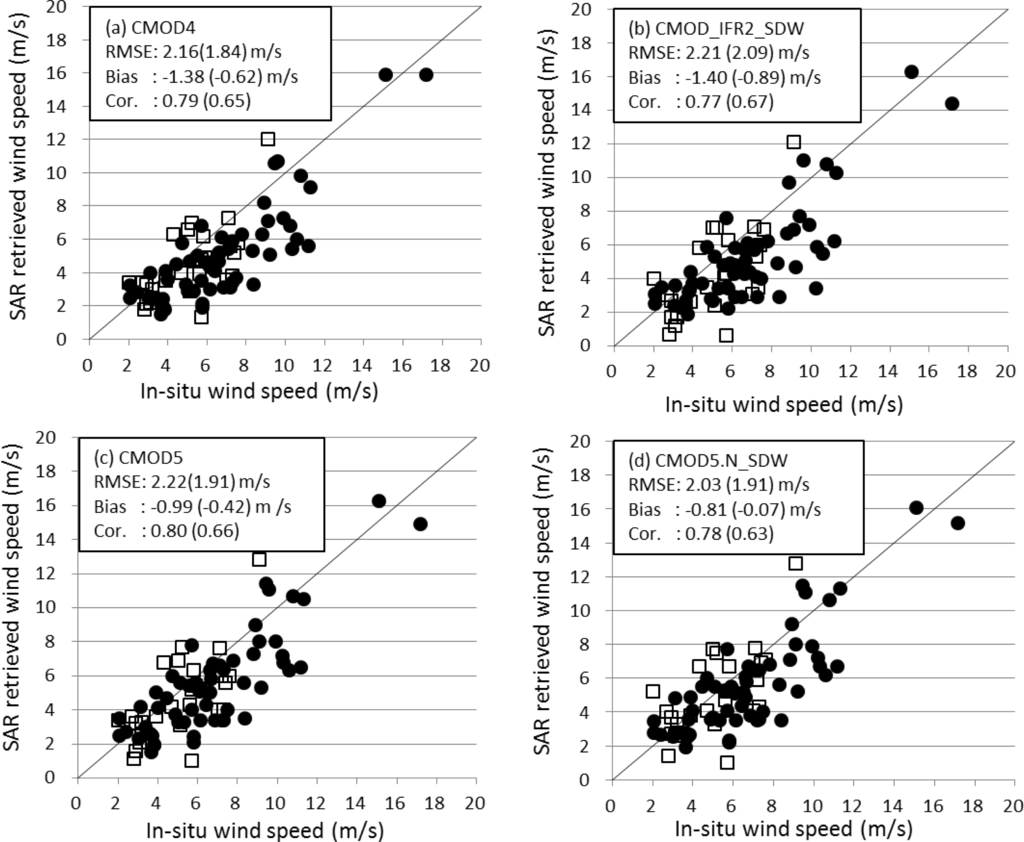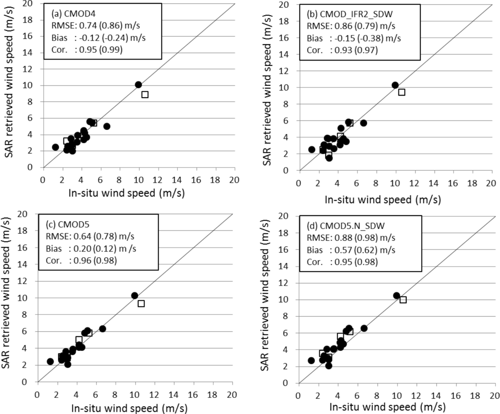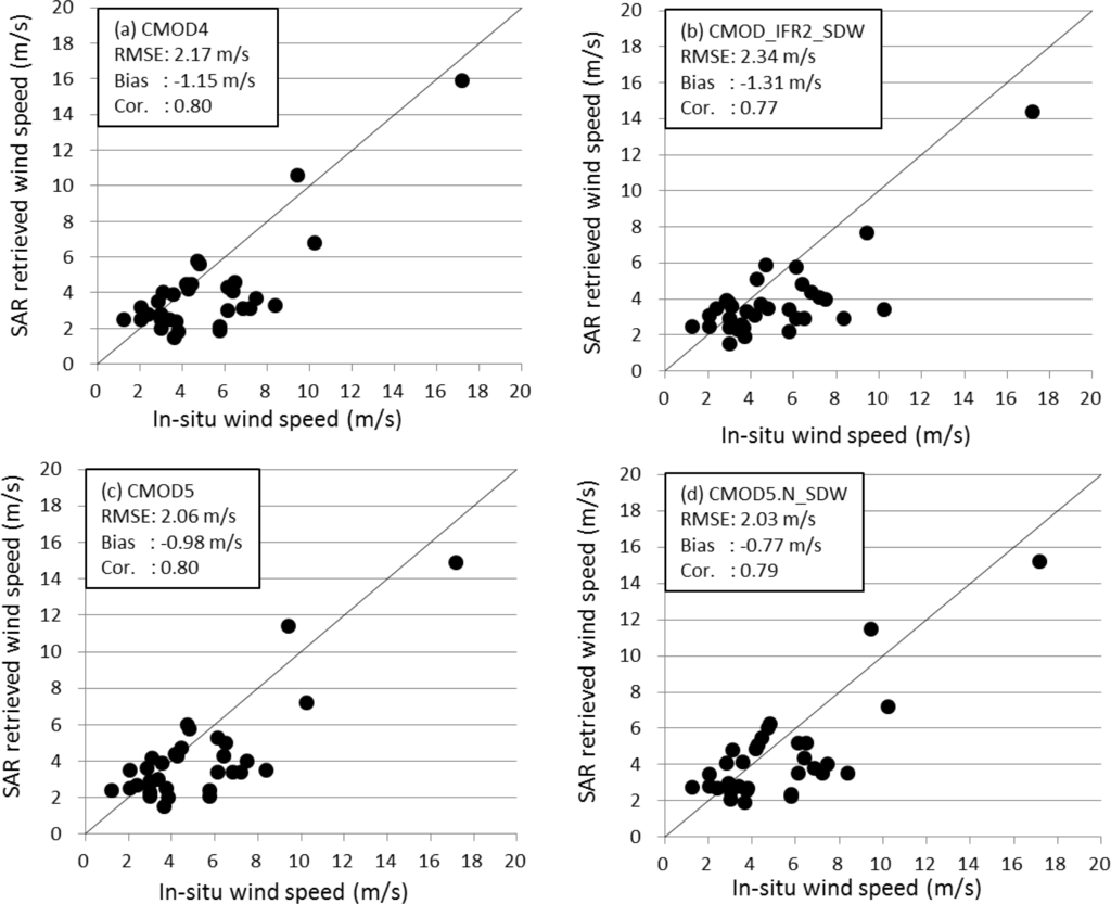 Relations between 33 SAR-retrieved wind speeds and in situ wind speeds at Hiratsuka using four GMFs: (a) CMOD4, (b) CMOD_IFR2, (c) CMOD5, and (d) CMOD5.N.