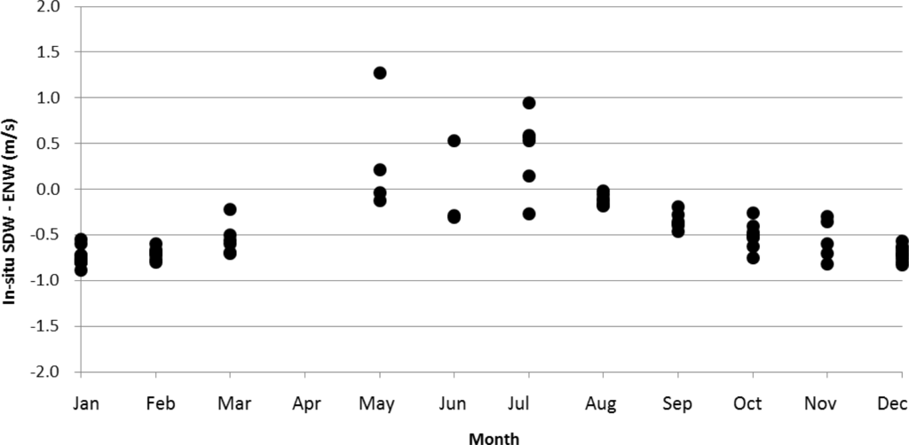 Monthly differences (m/s) between SDW and ENW for in situ measurements at Shirahama.