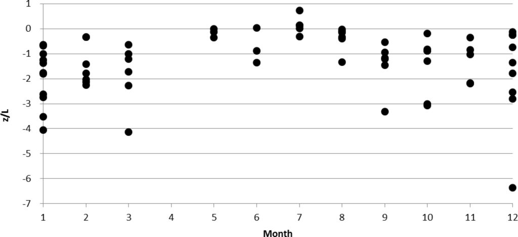 Monthly variation of z/L at Shirahama. But only 2 m/s or higher of the CMOD5.N-retrieved wind speed.