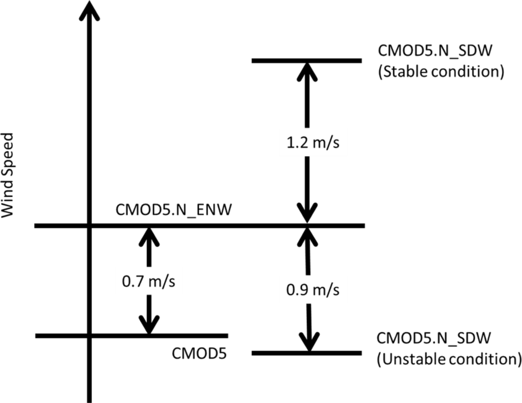 The relation between CMOD5, CMOD5.N_ENW and CMOD5.N_SDW is shown in Figure 9, based on the results in Section 3.1 and Figure 7. As shown in Figure 9, it is expected that the difference between CMOD5 and CMOD5.N_SDW decreases in the unstable condition, whereas it increases in the unstable condition. The small difference in the unstable condition is caused by the correction offset of about 0.7 m/s, which was enhanced when CMOD5.N had been developed from CMOD5 as shown in Figure 9.