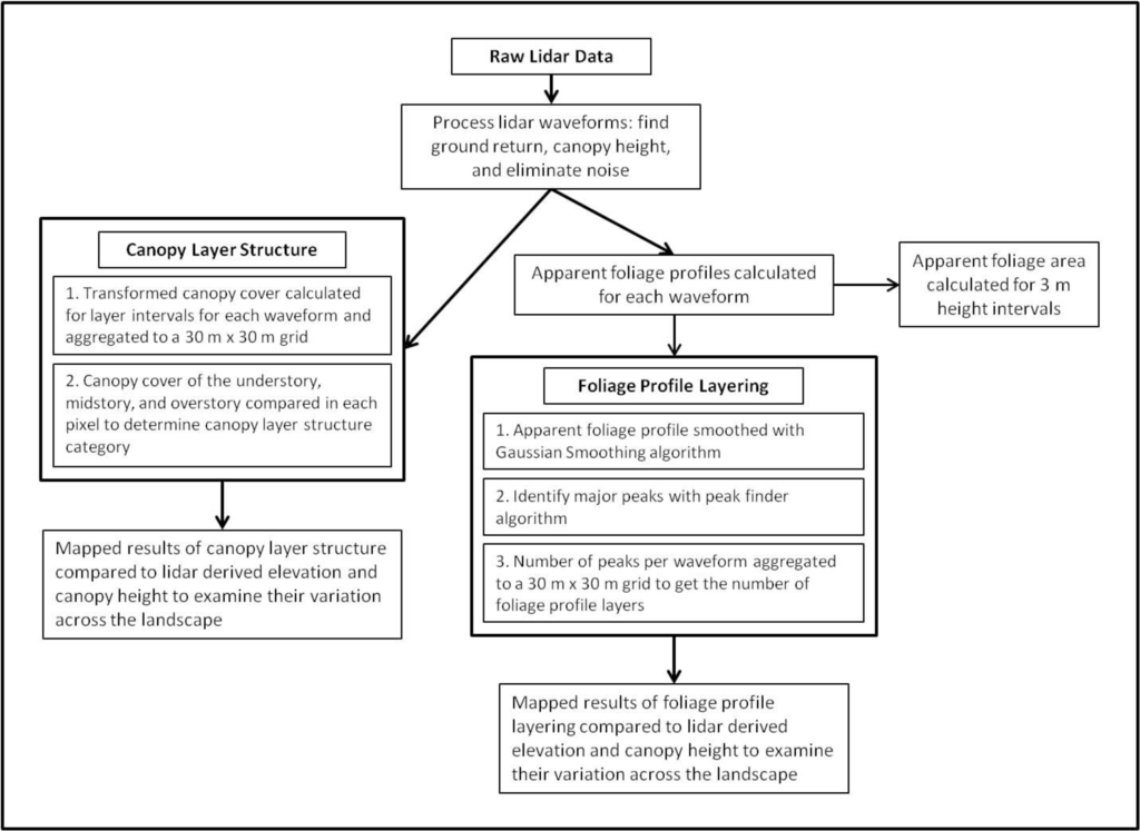 Thus, to more fully understand the role of vertical canopy structure in forest dynamics and species habitat, methodologies must be developed that bridge the gap between lidar remote sensing technology and ecological research and conservation application. Basing lidar metrics on variables understood in forestry and ecological research should result in more meaningful information and methodologies that can be applied across ecosystems [36]. Once this is accomplished, an exploration of factors affecting the spatial variability of vertical canopy structure may lead to important generalizations and insights applicable across ecosystems.