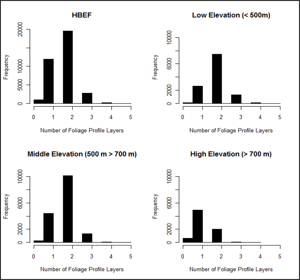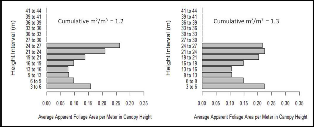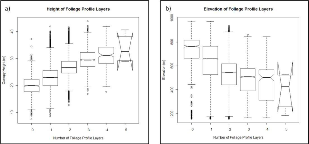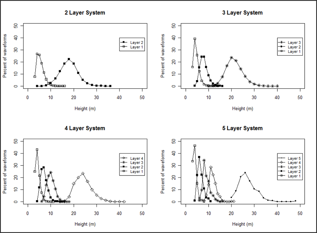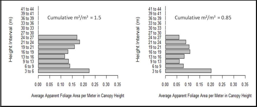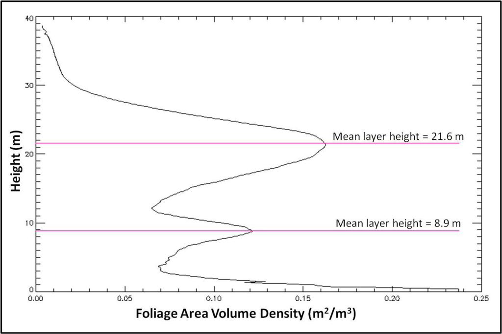 The foliage profile layering methodology provides a way of assessing the complexity of the canopy without relying on a priori height thresholds to determine the vertical distribution of canopy material. However, our analysis did not examine vertical structure of the canopy below 3 m. The 3-m threshold was used to avoid a potential source of error in the foliage profile algorithm caused by the mixing between the waveform ground return and the canopy return, which could inflate foliage area measurements near ground level [39]. It is thus possible that areas of dense foliage in the understory were missed in the profile layering analyses.