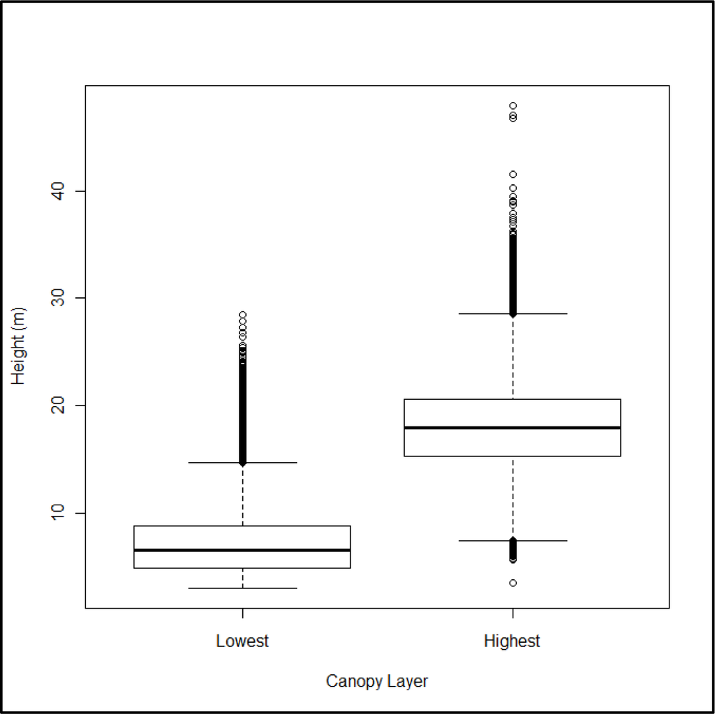 The number of foliage profile layers showed a clear, positive relationship with canopy height (Figure 11): as canopy height increases, the number of layers increases. Summary boxplots suggest a significant difference in median canopy height between most of the layer groups as well. Single-factor ANOVAs were also run between each number of foliage profile layers, confirming the significant difference (p < 0.05) in height between layers.