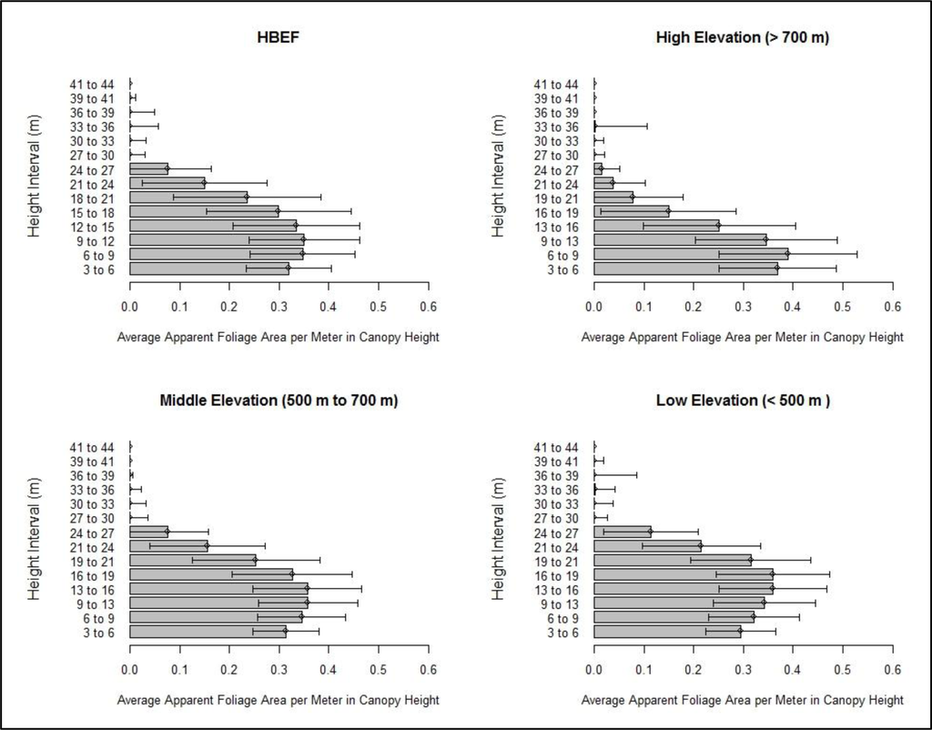 The apparent average foliage area profile for HBEF, divided into 3 m height intervals. The top-left graph shows the foliage profile averaged over all of HBEF. The error bars depict the standard deviation of foliage profile measurements for each of the height intervals. The averaged foliage profile for low elevations shows that the amount of foliage peaks between 13 and 19 m in the canopy. This peak in foliage area is lower for canopies at middle (9 to 16 m) and low (6 to 9 m) elevations.