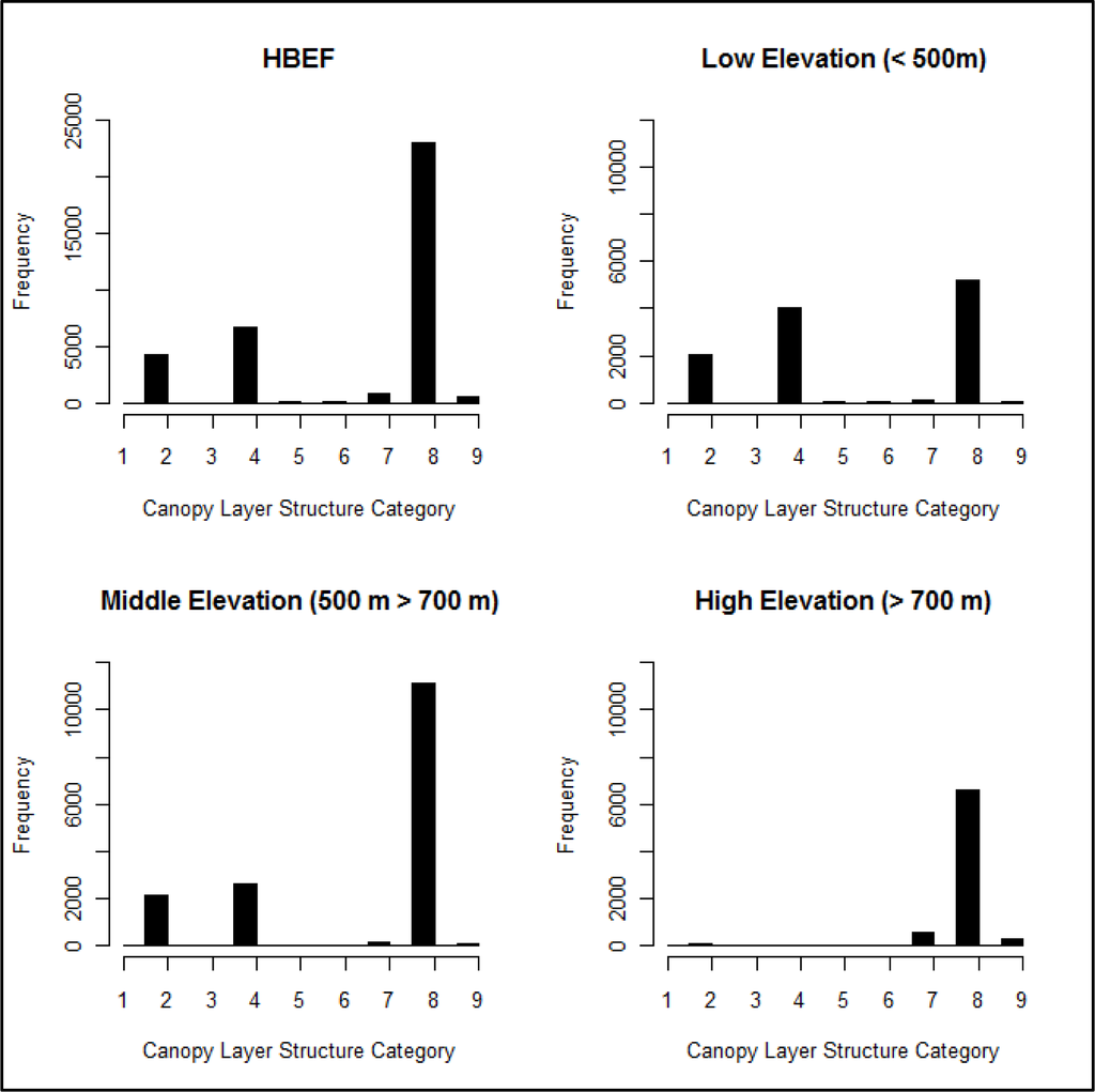 Histogram of canopy layer structure categories showing the number of pixels in each canopy layer structure category for all of HBEF (upper left) as well as at the low, middle, and high elevation levels.