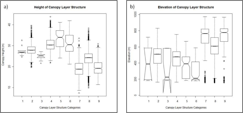 The presence of specific canopy layer structure categories was related to overall canopy height and elevation based on the significant difference of median canopy height and elevation for the majority of the categories; that is, some categories were differentiated based on the median canopy height and/or median elevation of that category relative to other categories (Figure 8). These results were supported with subsequent ANOVA results (p < 0.05). However, there was a wide range both in canopy height and elevation within categories. The categories with higher average canopy heights were categories 4 (30.7 m), 5 (33.4 m) and 6 (30.9 m), all of which have dominant overstory. Categories 7, 8, and 9, which have an open overstory, occur at lower elevations, with the average elevation of 692.1 m, 598.4 m, and 713.9 m, respectively.