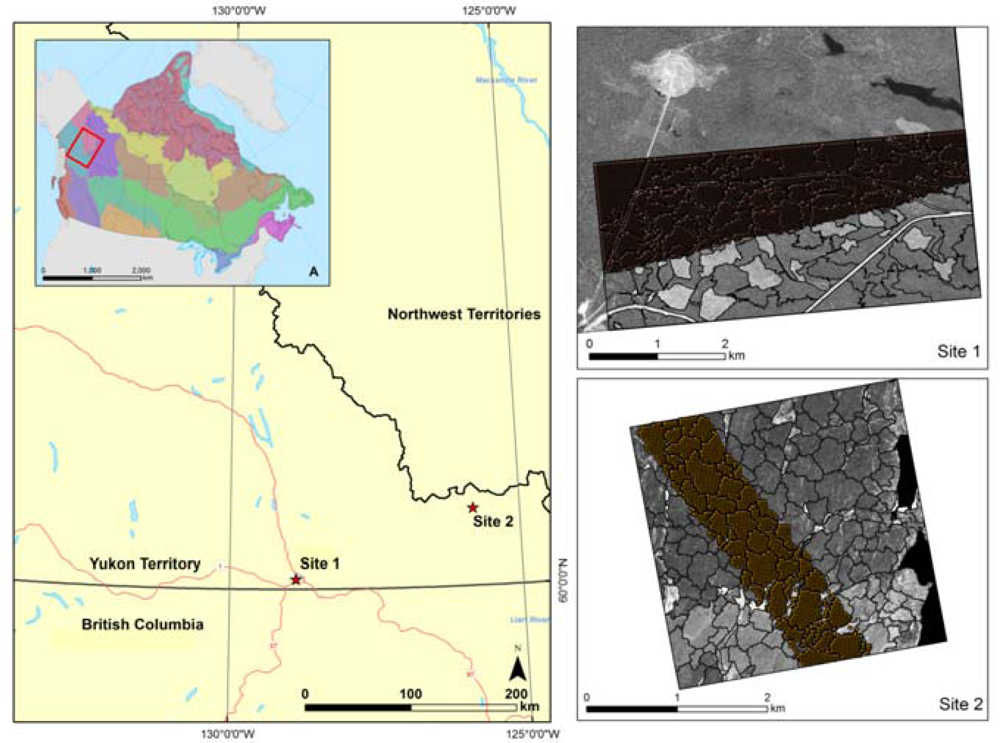 The Boreal Cordillera has been chosen as a test ecozone [21] for this research. The Boreal Cordillera is characterized by a climate ranging from cold and sub-humid to semi-arid. The study site, near Watson Lake, has an annual mean temperature of −2.9 °C, with mean monthly daily means ranging between −24.2 °C (January) and 15.1 °C (July) [22]. Over the Boreal Cordillera the mean annual precipitation ranges from less than 300 mm in valleys shadowed by coastal mountain ranges, to more than 1,500 mm at higher elevations. The topography of the Boreal Cordillera ecozone includes mountains, extensive plateaus, and wide valleys and lowlands. Glaciation, erosion, solifluction, and eolian and volcanic ash deposition have altered the topography. Glacial drift, colluvium, and outcrops are the most common surface materials. Permafrost is widespread in the more northern areas of the ecozone. Depending on local conditions, tree species include black spruce (Picea mariana), white spruce (Picea glauca), lodgepole pine (Pinus contorta), subalpine fir (Abies lasiocarpa), balsam poplar (Populus balsamifera), quaking aspen (Populus tremuloides), and paper birch (Betula papyrifera). Wildfire, insects, and, to a lesser extent, forest harvesting are the primary forest disturbances in the Yukon Territory. Two photo plots located in southern Yukon Territory have been chosen based on the availability of spatially coincidence of panchromatic VHSR and transects of LiDAR data (Figure 1).