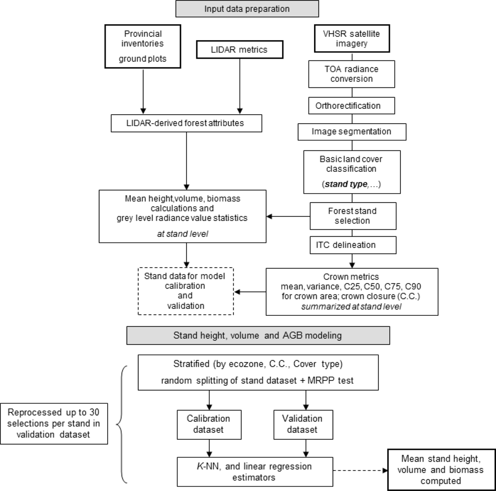 Stand height modeling was performed with k-NN and linear regression models (Figure 2). In the modeling protocol, we identified stand level median grey level value from the VHSR data and the C90 of crown size distribution as the most suitable input variables. The protocol was based on multiple random selections that split the original dataset into calibration (60% of the stands) and validation datasets (40% of the stands). These iterative random draws were stratified according to the stand crown closure, which is known to influence the calculated stand metrics [42,43]. Modeling methods were implemented using the R software [44]. The package stats (version 2.13.2) was used for the linear regression modeling, and the package yalmpute (version 1.0–15) was used for the k-NN method [45]. The number of k neighbors to use was estimated based on the computation of one thousand random stand selections used as calibration and validation datasets followed by stand height modeling. The test was repeated for values of k ranging from 1 to 30. The value of k providing the best stand height estimations was selected for the subsequent tests. Varying distance computation methods were tested: Euclidean, Mahalanobis, two Most Similar Neighbor methods (noted MSN and MSN2), and an independent component analysis based method [45]. The final stand height corresponded to the average of the height estimates obtained from the k-NN modeling through the required iterations. Stand volume and AGB model establishment followed an identical framework as the one used for the stand height modeling with the addition of a stepwise linear regression method introduced as a first step to identify the best input metrics amongst the tested predictors.