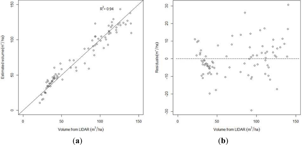 (a) Scatter plot of the best estimated volume values versus LiDAR volume values (b) Residuals of the best model versus stand LiDAR volume values.