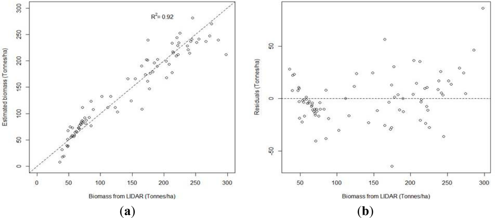 (a) Scatter plot of the best estimated biomass values versus LiDAR biomass values (b) Residuals of the best model versus stand LiDAR biomass values.