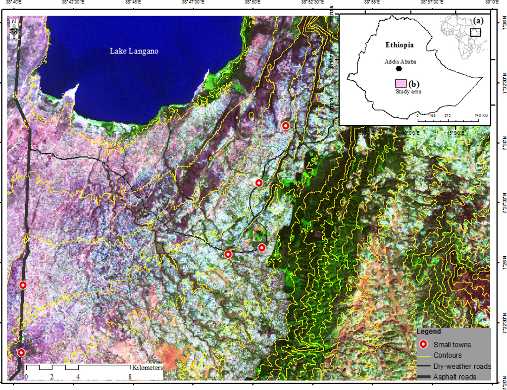 A 30 m Digital Elevation Model (DEM), based on Aster imagery, was also employed in order to study the relationship between LULC types with that of the slope gradient and agro-ecological zones of the study landscape. In addition, ancillary data were also utilized during analysis, including topographic maps, field data, thematic layers (roads and towns), Kebele and Wereda boundaries. All data were projected to the Universal Transverse Mercator (UTM) projection system zone 37N and datum of World Geodetic System 84 (WGS84), ensuring consistency between datasets during analysis. The pre-processing was made using ArcGIS 10 software. Fieldwork was conducted between November 2011 and January 2012 using draft classified maps derived from satellite images with reference years, aerial photos and topographic maps as guides. GPS coordinates of target LULC types were collected, and information regarding each site was noted. Thematic layers of towns were used to facilitate the classification process. Roads with other datasets were utilized for the study site map preparation.