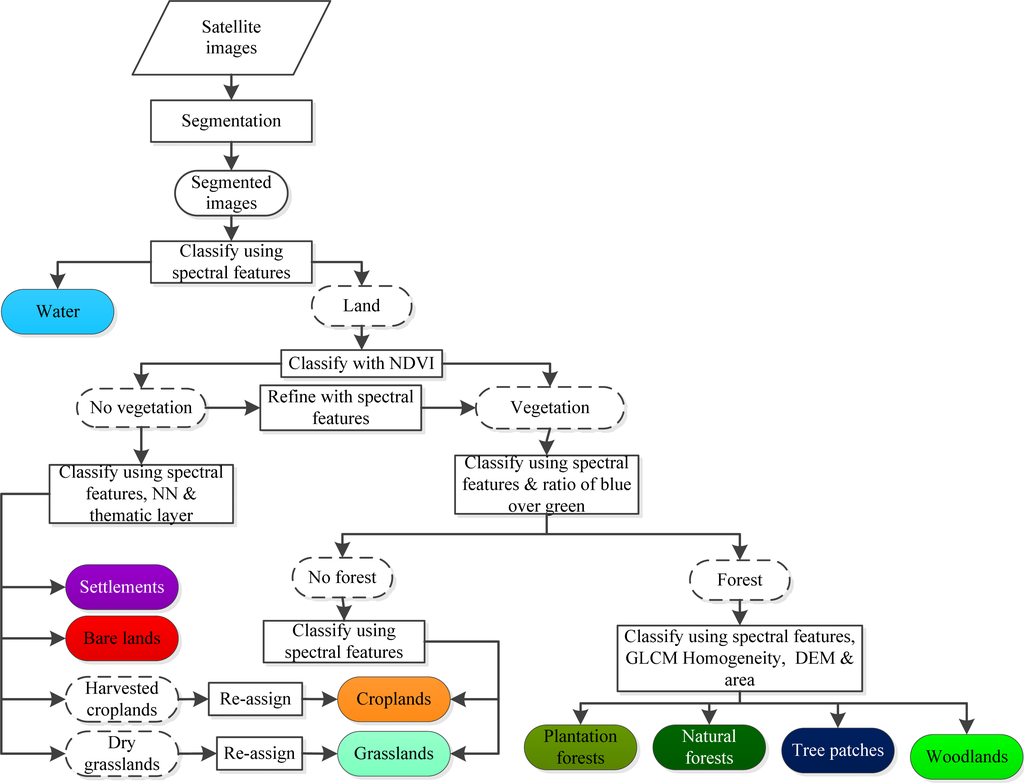 We used various sources, including field survey, ancillary data and existing Afri-cover classification approaches to set and implement our object-based classification schemes. Nine LULC classes were considered for this purpose (Table 3). Considering the power of object-based methods, an attempt has been made to separate forest types, e.g., natural forests and woodlands, in our classification schemes. This is owing to their differences in providing services and goods, and the underlying pressures towards the resources. Classifying them separately can also facilitate conservation, utilization, and management approaches.