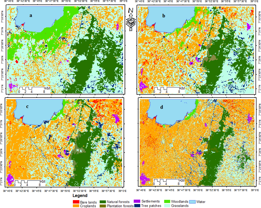 The change results revealed a considerable reduction of woodlands, natural forests and grasslands over the first (1973–1986), second (1986–2000), and third (2000–2012) study periods. The total woodlands converted between the first study period amounts to 9,692 ha, which is about 82% of the cover that existed in 1973. The woodlands were further cleared by about 52% and 36% of the cover that existed in 1986 and 2000 during the second and third periods, respectively. Similarly, natural forests cover decreased by 26.1% during the first, 21.1% during the second, and 24.4% in the third periods. Grasslands also declined by 11.9%, 17.5% and 21.1% during the first, second, and third periods, respectively. On the contrary, croplands increased in all three periods by 131%, 31.5%, and 22.7% during the first, second and third periods. Similarly, bare lands increased by 326.2%, 9.3% and 10.5% in the three periods, respectively. Water showed a slight reduction during the whole study period (Table 6).